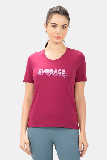 Apart from providing unmatched comfort and ease of movement during workouts, gym t-shirts have several other benefits. They’re designed for intense workouts on hot summer days. The four-way stretch and breathable fabric of a gym t-shirt wicks away sweat and keeps you feeling dry and cool. Besides wicking away sweat and quick drying, the gym t-shirt fabric also prevents the growth of bacteria. For better performance, it’s best to choose flexible gym t-shirts that allow your body to move easily. You want your gym t-shirt to be comfortable. Wearing a fitted or too tight gym t-shirt can restrict your workout movements. Zivame brings a wide selection of gym t-shirts for women to make your workout more enjoyable. From relaxed cotton top, easy movement quick dry t-shirt, relaxed fit quick dry gym t-shirt to true curve high-quality stretch top, just dry performance t-shirt, raglan sleeve gym t-shirt, as well as track pants for women, gym leggings and many more. Depending on your style and preferences, you can choose the best gym t-shirt for a women's workout from Zivame’s gym wear collection. So, without further delay, browse through Zivame’s gym t-shirt category, add your favourite gym t-shirt to the cart, and get them delivered to your doorstep!