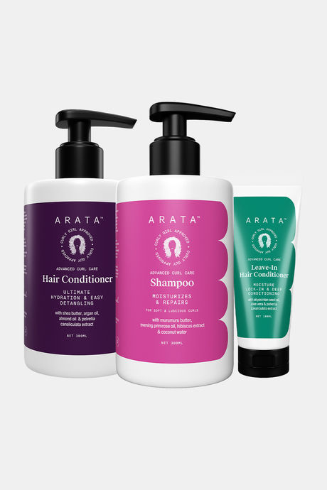 Arata Advanced Curl Care Hair Shampoo (300 Ml), Rinse-Out Conditioner (300 Ml) & Leave-In Conditioner (100 Ml) | Hibiscus Extract, Coconut Water & Shea Butter | Cleanses & Conditions Curls | Cg Approved