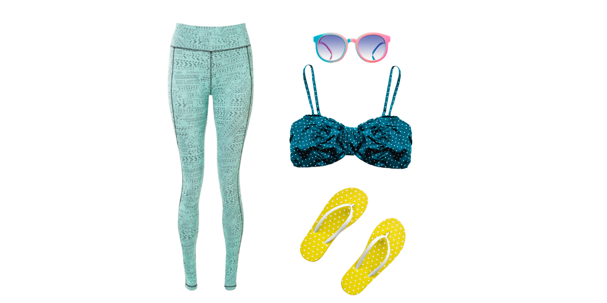 If you’re the kind of person who loves to take a stroll on the beach and snap great photos while splashing some fun, consider wearing high waisted yoga pants and add some colour to it with a bright pop bikini top. Complete the look with oversized sunglasses and flipflops!