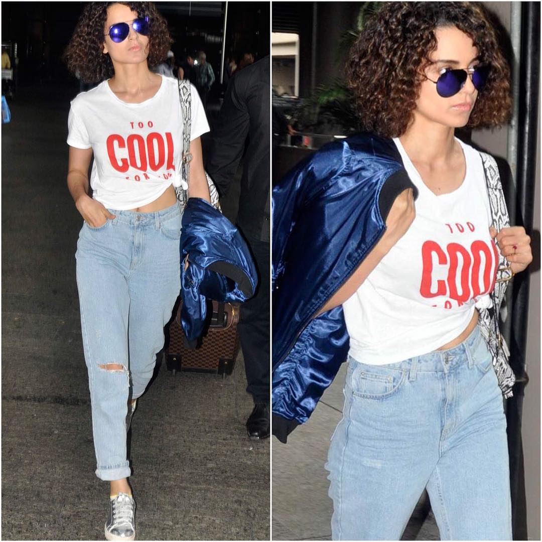 Kangana knows airport style and here she nails this casual comfortable look with ease. Wearing a knotted white T-shirt over ripped jeans with comfy sneakers and blue shades, she perfectly personifies her ‘too cool to care’ attitude! Note the jacket because we all know the aeroplane AC has a habit of acting up.
