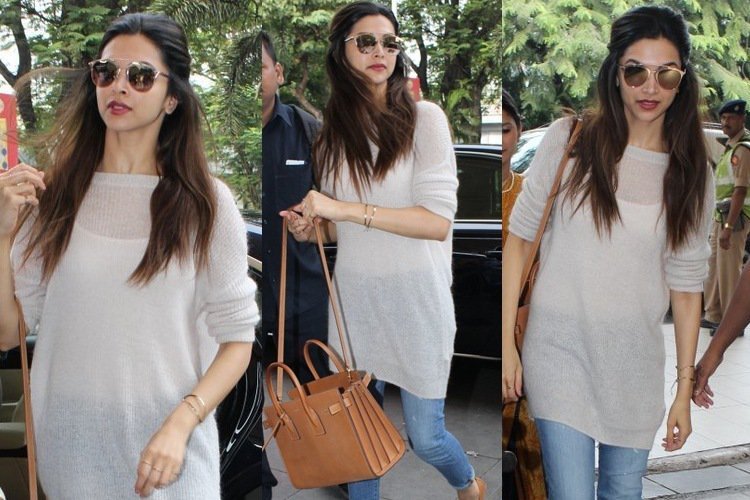 Deepika sure knows how to make the temperature soar when she steps out on the tarmac. This sheer top, paired with skinny jeans and loafers looks absolutely chic. The added oversized bag and funky sunglasses complete her airport look with class.