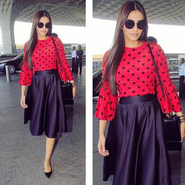 India’s favourite fashionista is best known for her avant-garde outfits on the red carpets. But time and again, she has pulled off some glamorous looks at the airport too! She knows what to put together to look her best in transit – as she does here in a skirt and polka print blouse.