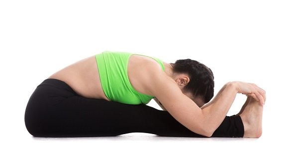 – Lengthen your spine and place your hands anywhere on your legs. If it’s comfortable, touch your toes. You can bend your knees slightly if you feel pain in the back