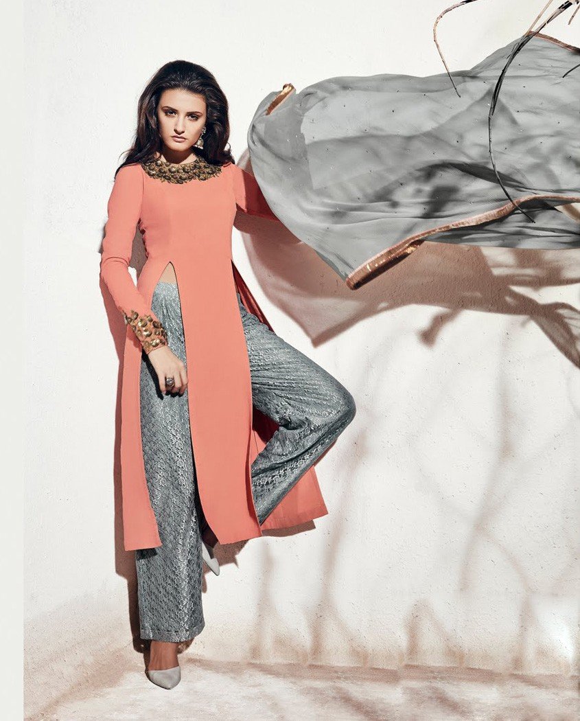 We’re seriously crushing on this designer kurta and we’re sure you will too! With a gorgeous dhoti-like drape starting under the bust, it flares at the waist and tightens at the calf, giving you a beautiful shape. Wear it with gathered leggings or traditional churidars in the same shade as the drape. Opt for jooti’s with block heels and glittering jhumkas. A tiny nose-ring will add to this trendy traditional look too.