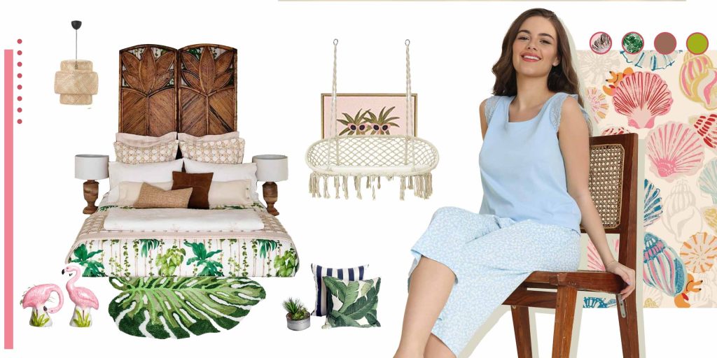 If you adore playful capri and shorts sets, why not transform your bedroom into a whimsical tropical paradise? Go for bright and vibrant bedding with fun, lively patterns or exotic prints. Throw in some flamingo and pineapple decor, potted plants, beachy wall art along with a hammock chair to add a touch of escapism to your bedroom, so it feels like a vacation every night.