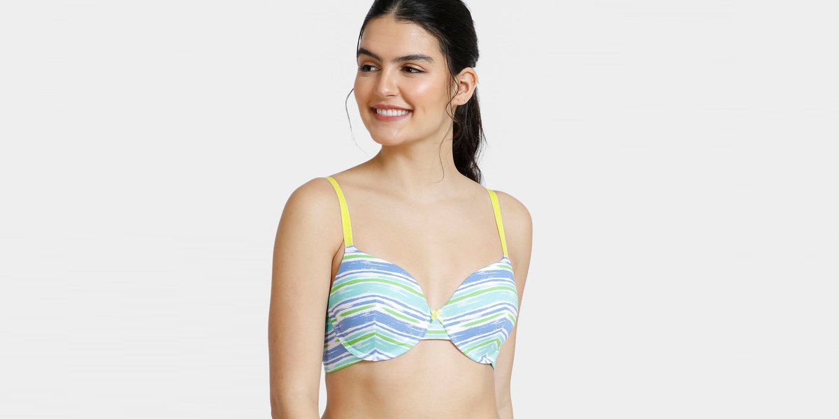 Zivame Whimsical Padded T-Shirt Bra: This Bra celebrates all the colours of the cool blue ocean. The blue, green stripes with contrasting yellow straps lend this Bra a bright and quirky look. This quintessential T-shirt Bra is padded for a no-show through look, wired for essential support and has 3/4th coverage to control spillage. A beach vacay may not be possible right away, but a girl can dream and pick out the perfect beachy outfits!