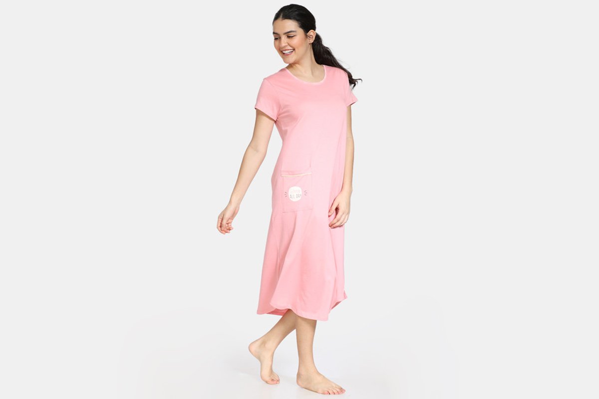 Zivame Paper Town Knit Cotton Knee Length Night Dress: