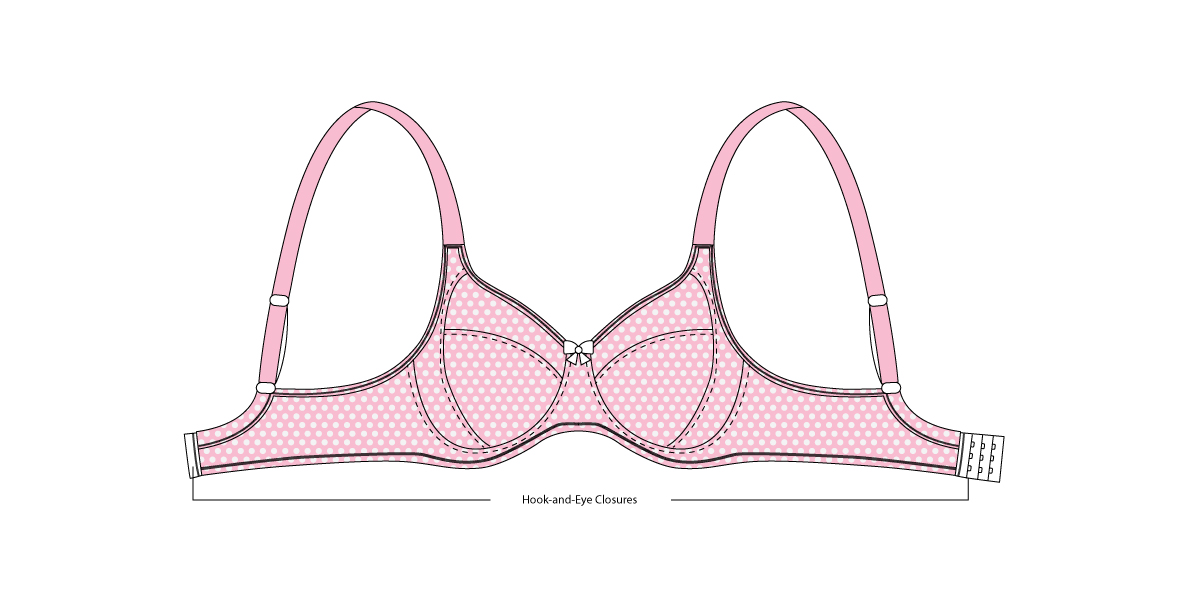 Hook and eye closures are used to fasten the bra around your body. They may be situated at the back or in the front (as in front open bras). Make sure to start from the last column of hooks and work your way in gradually as the underband slowly loosens up. Sometimes, these are traded for zippers in sports bras.