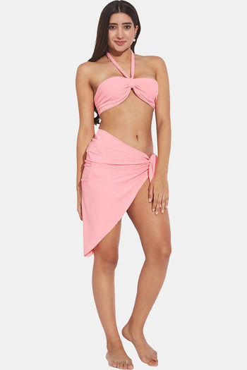 Secrets By ZeroKaata Stretchable Ribbed Bikini Set With Sarong - Pink