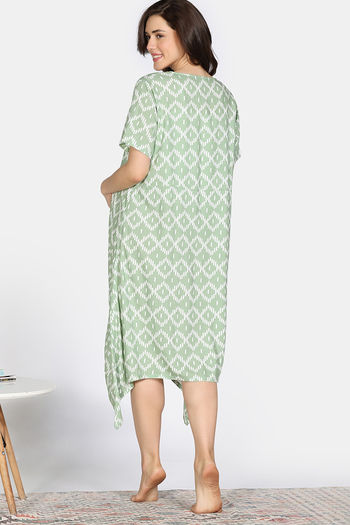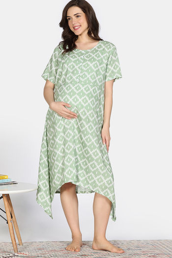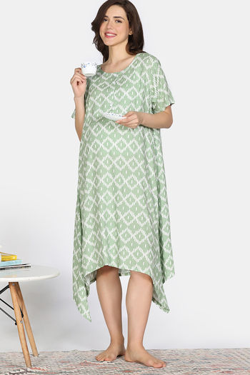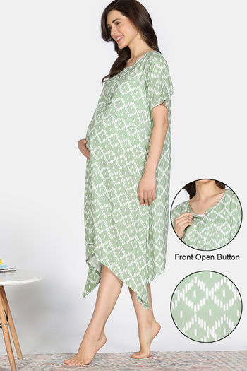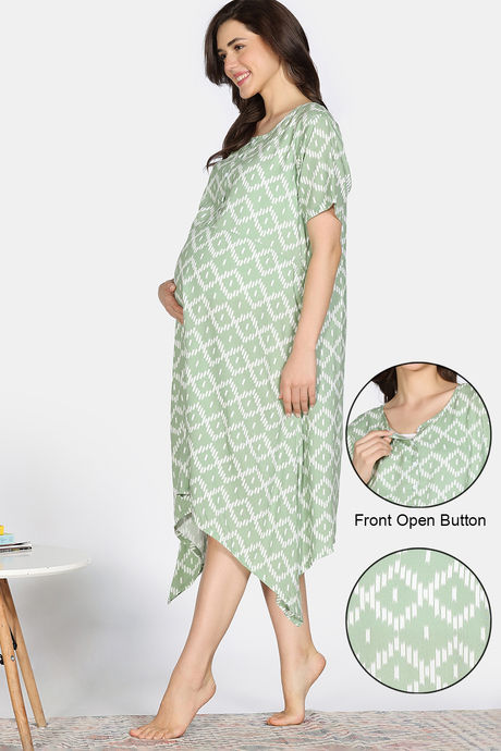 Coucou Maternity Woven Mid Calf Length Loungewear Dress With Front Open Button - Crocodile Green