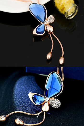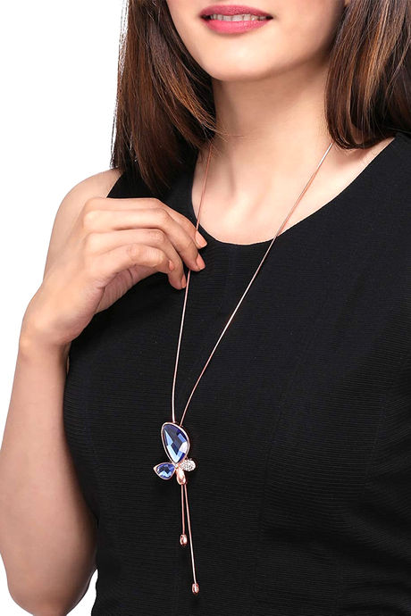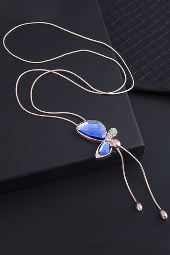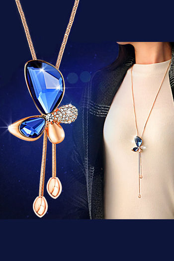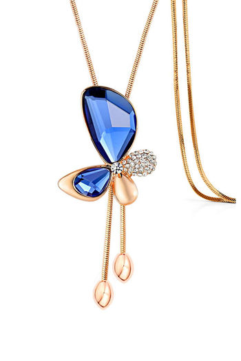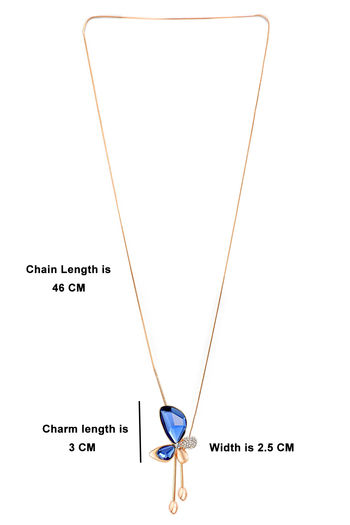 Yellow Chimes Crystal Blue Butterfly Rose Gold Stylish Long Chain Pendant Necklace - Gold
