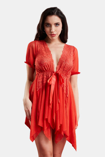 Buy Secrets By ZeroKaata Sheer Self Design Baby Doll For Women- Red