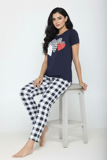Buy Zivame Buttersoft Knit Poly Pyjama Set - Navy Peony