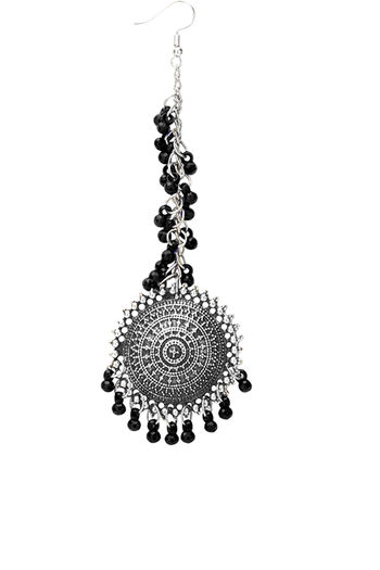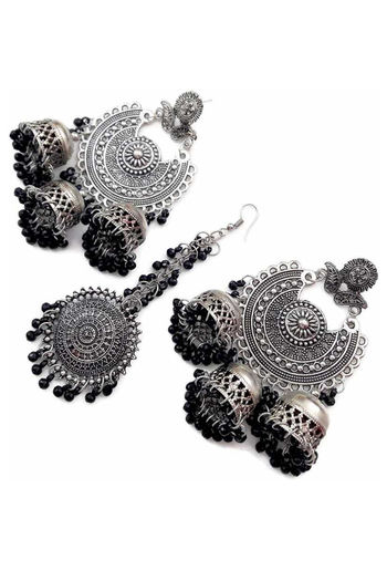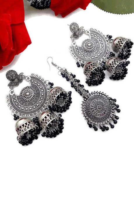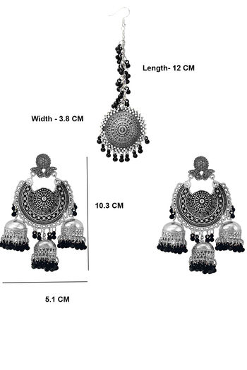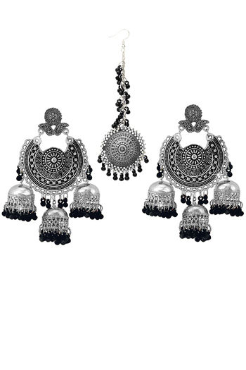 Yellow Chimes German Oxidised Silver Traditional Maang Tikka with Jhumka Earrings - Silver