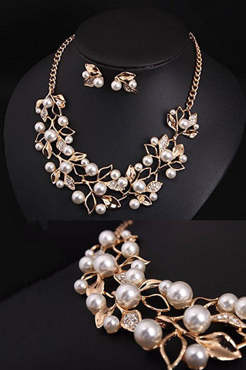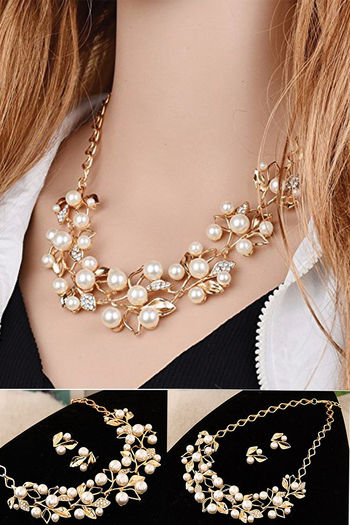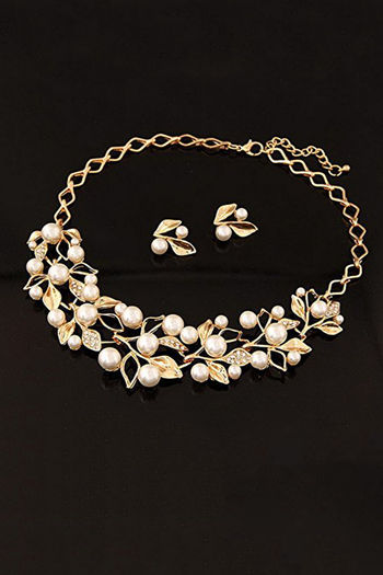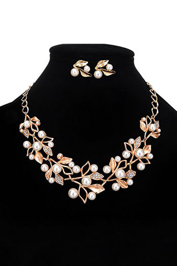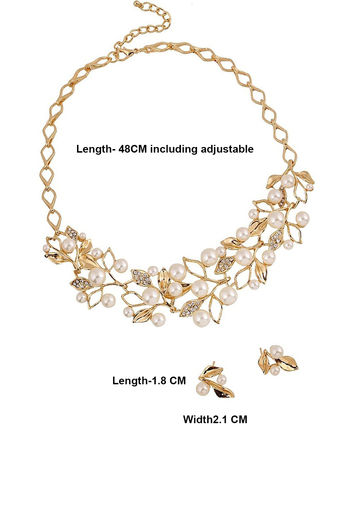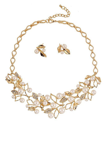 Yellow Chimes Leaf Design Gold Toned Pearl Crystal Necklace Set - Gold