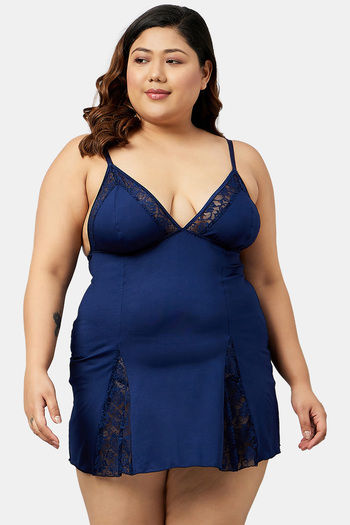 Secrets By ZeroKaata Plus Size Solid Baby Doll with Thong- Navy Blue