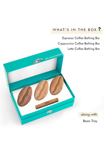 mCaffeine Coffee Beans Gift Kit - Set of Espresso, Cappuccino & Latte Coffee Bathing Bar Soaps with Handcrafted Bean Tray (300 g)