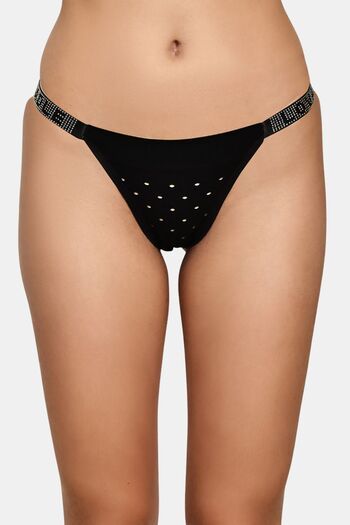 PrettyCat Chic Low Rise Bikini Panty with Rhinestone Strap Detail - Black