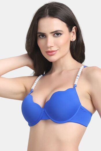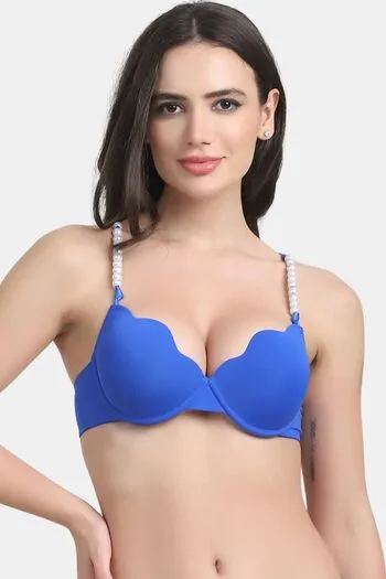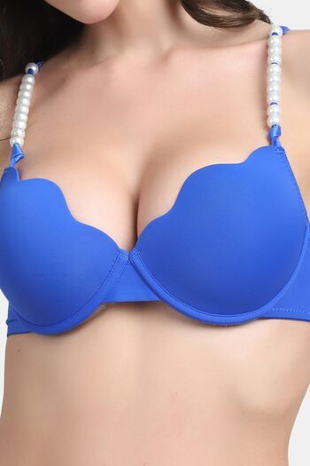 PrettyCat Lightly Padded Scalloped Sexy Plunge Bra With Pearl Strap - Blue