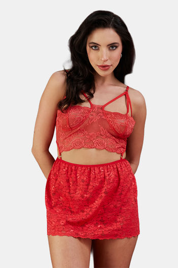 Buy  Secrets By ZeroKaata Sheer Self Design Lace Baby Doll For Women- Red