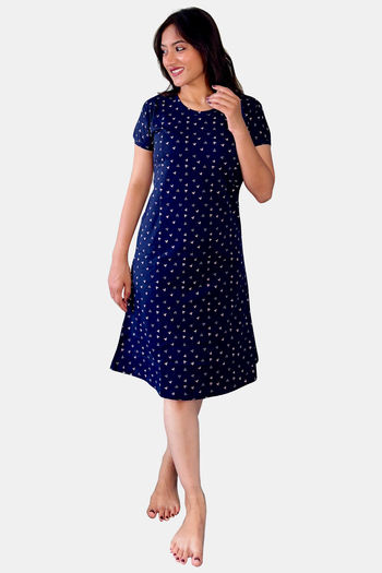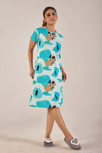 Buy Sweet Moon Knit Cotton Mid Length Nightdress - Ocean Bluenwhite