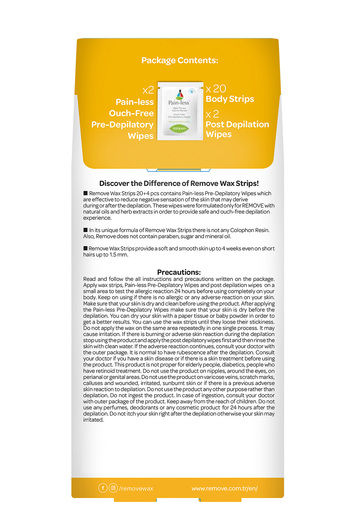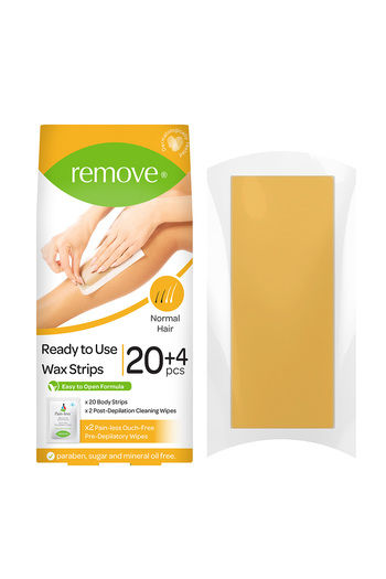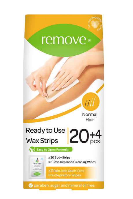 Remove Wax Strips 24 Pcs Body Strips - Normal Hair (20 Body Strips & 2 Pain-Less + 4 Post Depilation Cleaning Wipes)
