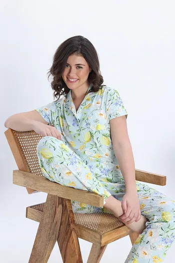 Zivame Mid Night Munchies Knit Cotton Pyjama Set - Green N Print