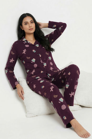 Zivame Farm Lore Knit Cotton Pyjama Set - Plum Purple
