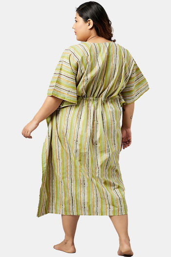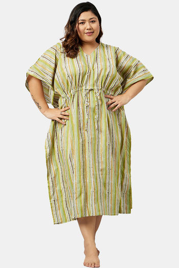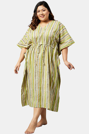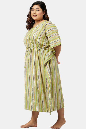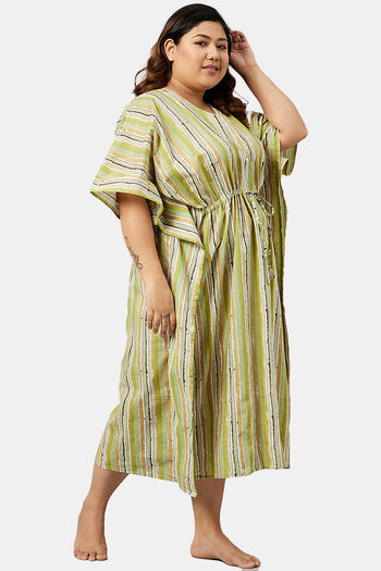 Secrets By ZeroKaata Plus Size Pure Cotton Printed Kaftan Cover Up - Green Print