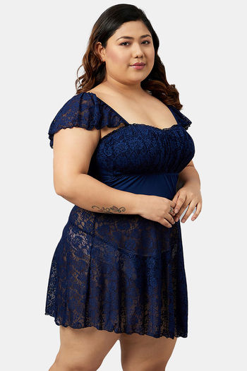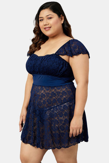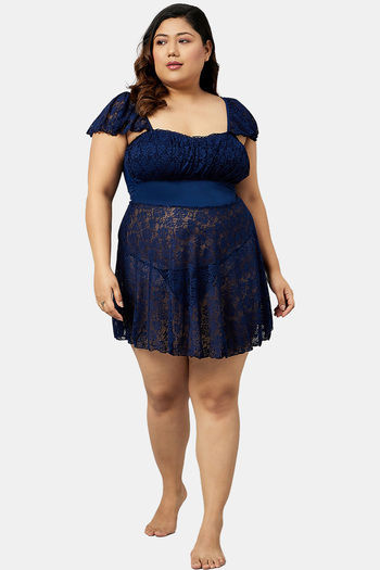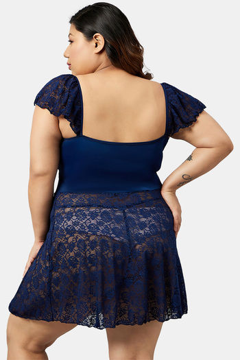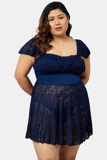 Secrets By ZeroKaata Plus Size Self Design Lace Baby Doll with Thong- Navy Blue
