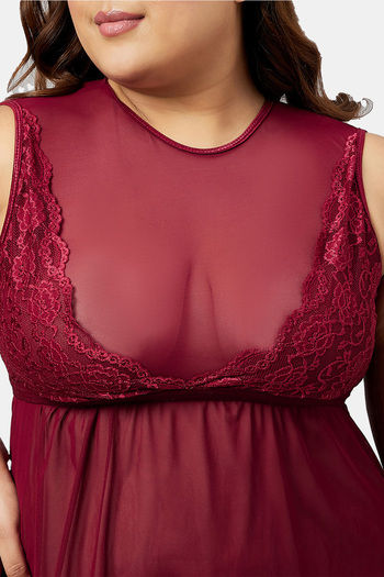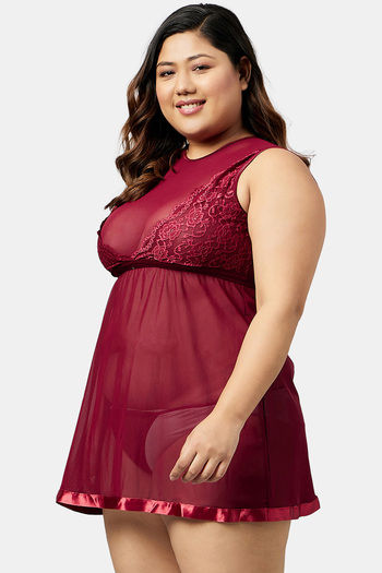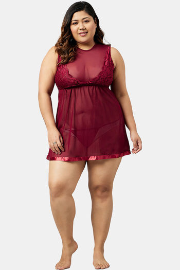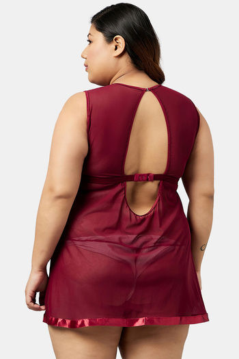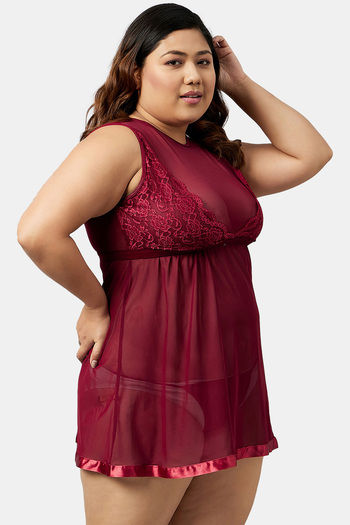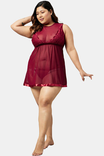 Secrets By ZeroKaata Plus Size Self Design Powernet Baby Doll with Thong- Maroon