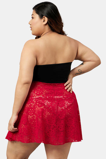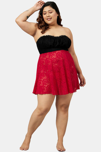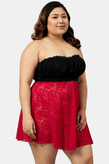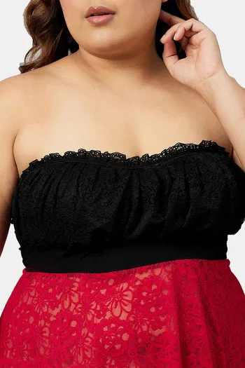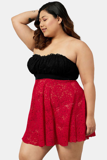 Secrets By ZeroKaata Plus Size Strapless Lace Baby Doll with Thong- Red