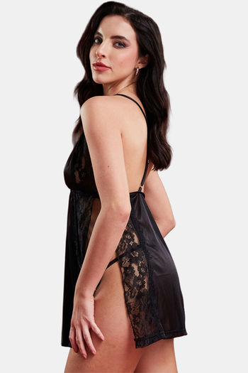 Secrets By ZeroKaata Self Design Baby Doll For Women- Black