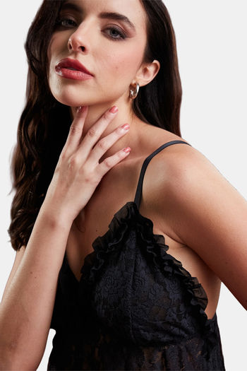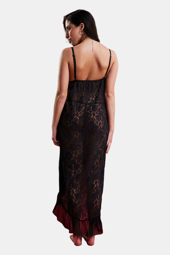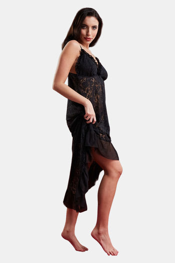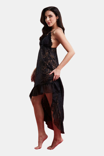 Secrets By ZeroKaata Sheer Self Design Long Baby Doll For Women- Black