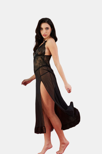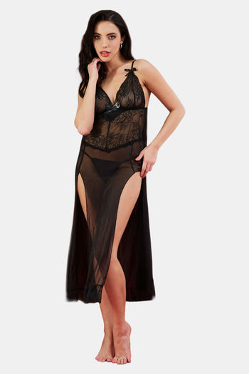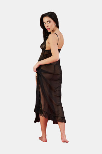 Secrets By ZeroKaata Sheer Self Design Long Baby Doll For Women- Black