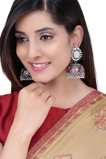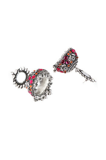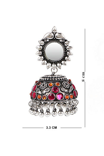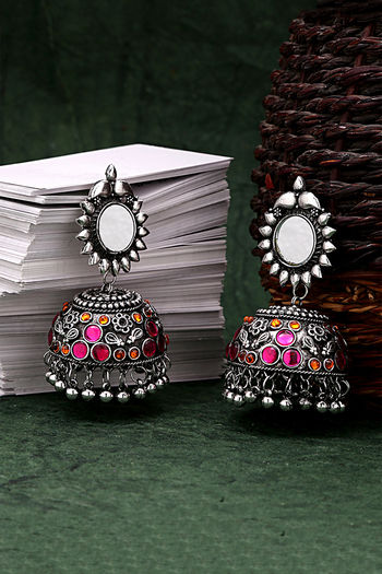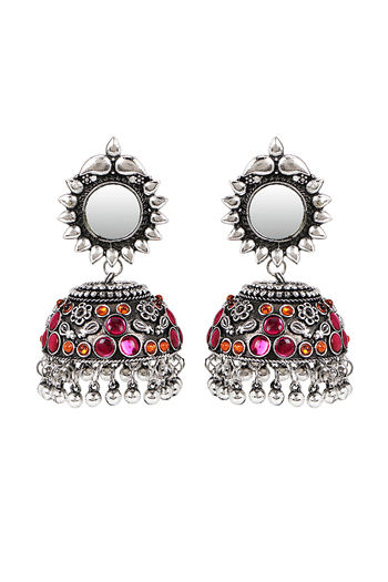 Yellow Chimes Silver Oxidized Light Weight Mirror Worked Floral Design Pink Jhumka Earrings
