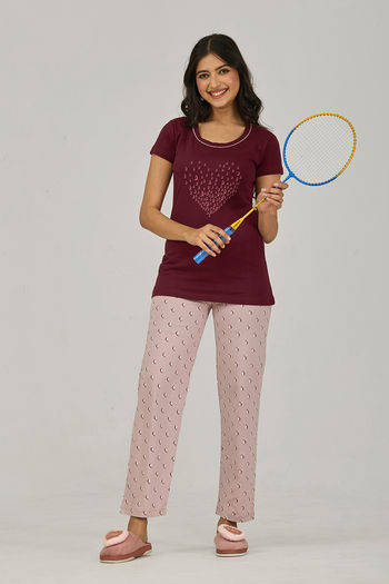 Buy Sweet Moon Knit Cotton Pyjama Set - Nudeviolet Darkmarun