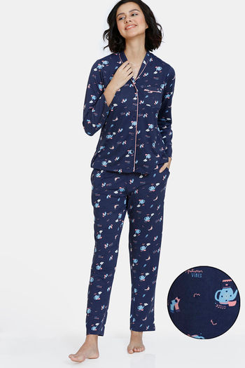Zivame Mid Night Munchies Knit Cotton Blend Pyjama Set - Navy N Print
