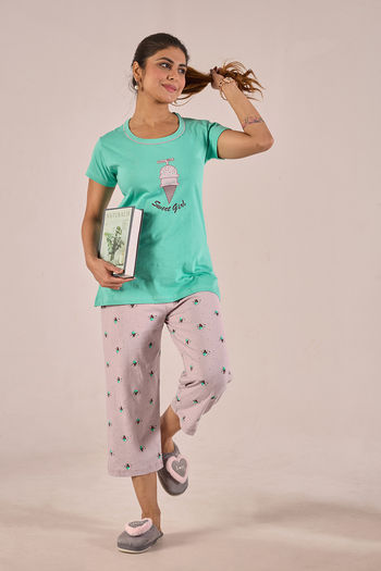 Make your nights trendy and comfortable with Zivame’s women’s capri sets. Similar to a night suit for women , women’s capri sets are made from soft cotton and are comfortable and stylish at the same time. The soft material of the women’s capri sets ensures that you remain cool and relaxed on warm summer nights. They easily double up as loungewear. In short, be it catching a snooze, enjoying a slumber party with your girlfriends, or simply watching your favourite shows at home, these women’s capri sets would be a perfect comfort partner. Right from great colours to cute patterns, you are spoilt for choice here. We have women’s capri night sets for all sizes, from XS to 3XL.