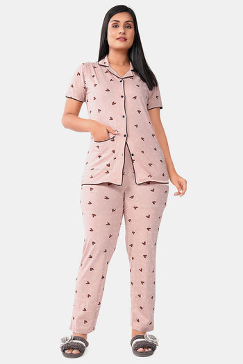 Sweet Moon Knit Cotton Pyjama Set - Pink And Brown Combination
