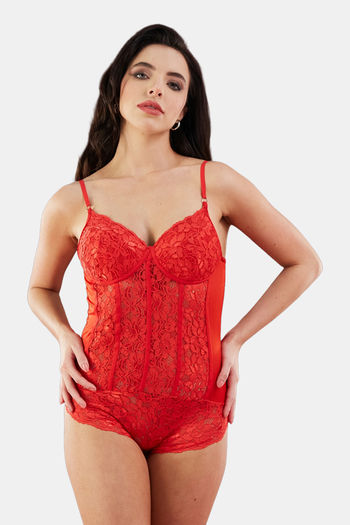 Buy  Secrets By ZeroKaata Sheer Self Design Lace Baby Doll For Women- Red