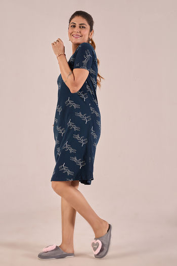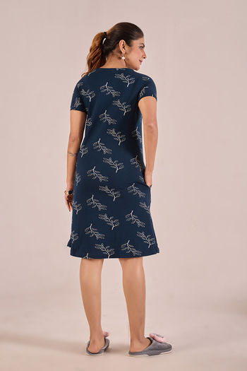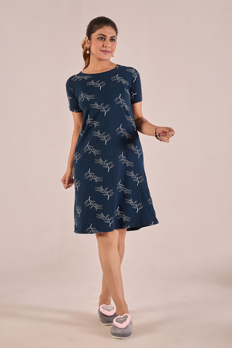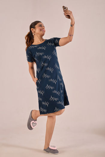 Sweet Moon Knit Cotton Mid Length Nightdress - Prussian Blue