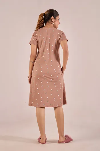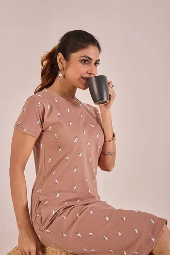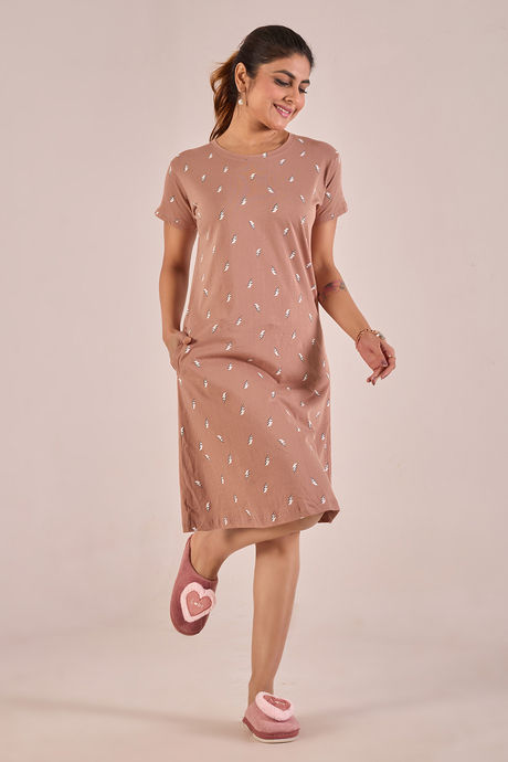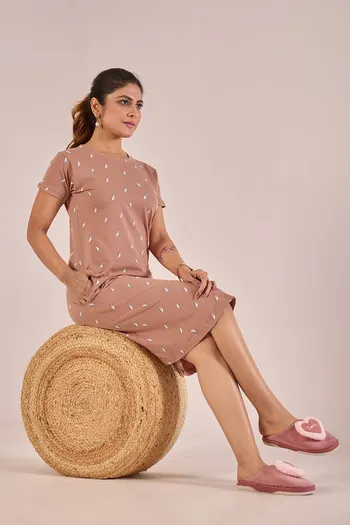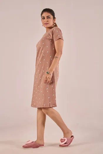 Sweet Moon Knit Cotton Mid Length Nightdress - Warm Clay