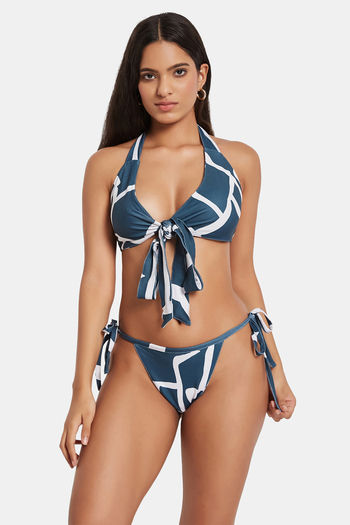· Bikini Set: Bikinis are a beach favourite attire for women to showcase their sun-kissed skin during beach vacations, pool parties, or other water-related activities. With its summery appeal, vibrant colours, sensual style, and versatile design, you can create a jaw-dropping glamourous beach look with this two-piece swimsuit. Some popular bikini top styles at Zivame have a triangle, bandeau, halter, or bralette design that covers your breast, securing them with adjustable closures using straps at the back or neck. The bikini bottoms featuring string, hipster, high-waisted, or Brazilian-cut style may have elastic bands or side ties for a secure fit and offer coverage for the groin area. Featuring flattering cuts and styles you can try on our Zelocity Padded Bikini Set with Hook or Erotissch Rossie Vikini Co-ord Set for your beach vacation!