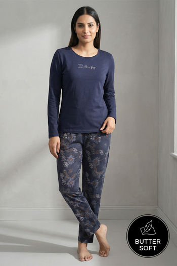 Buy Zivame Buttersoft Knit Poly Pyjama Set - Navy Peony