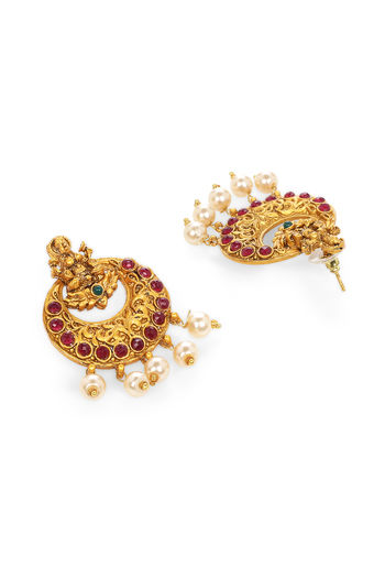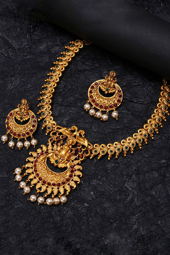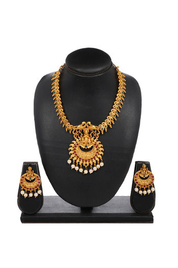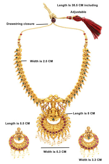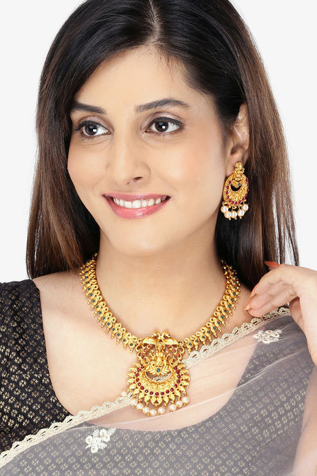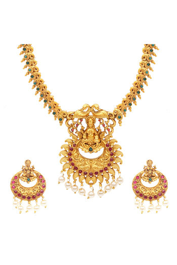 Yellow Chimes Traditional Stone Studded Gold-toned Handcrafted Temple Jewellery Set