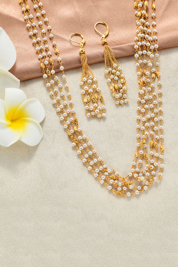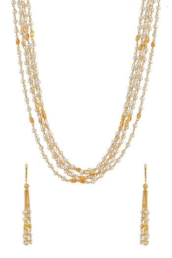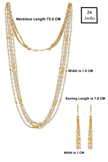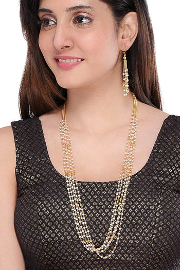 Yellow Chimes White Pearl Multi-Layer Gold Plated Long Chain Necklace Set with Earrings