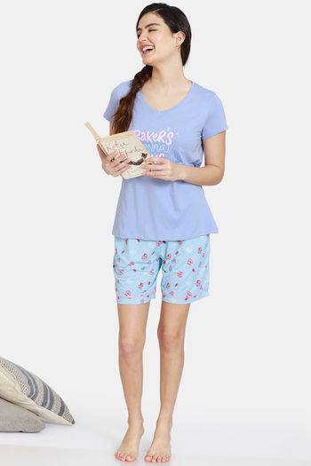 Zivame Bakers Nest Knit Poly Shorts Set - Crystal Blue