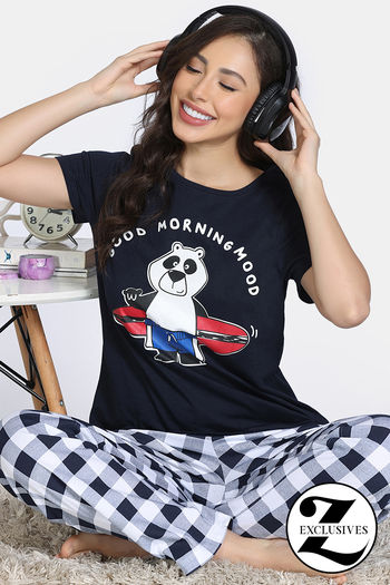 Zivame Knit Cotton Loungewear Set - Black Forest