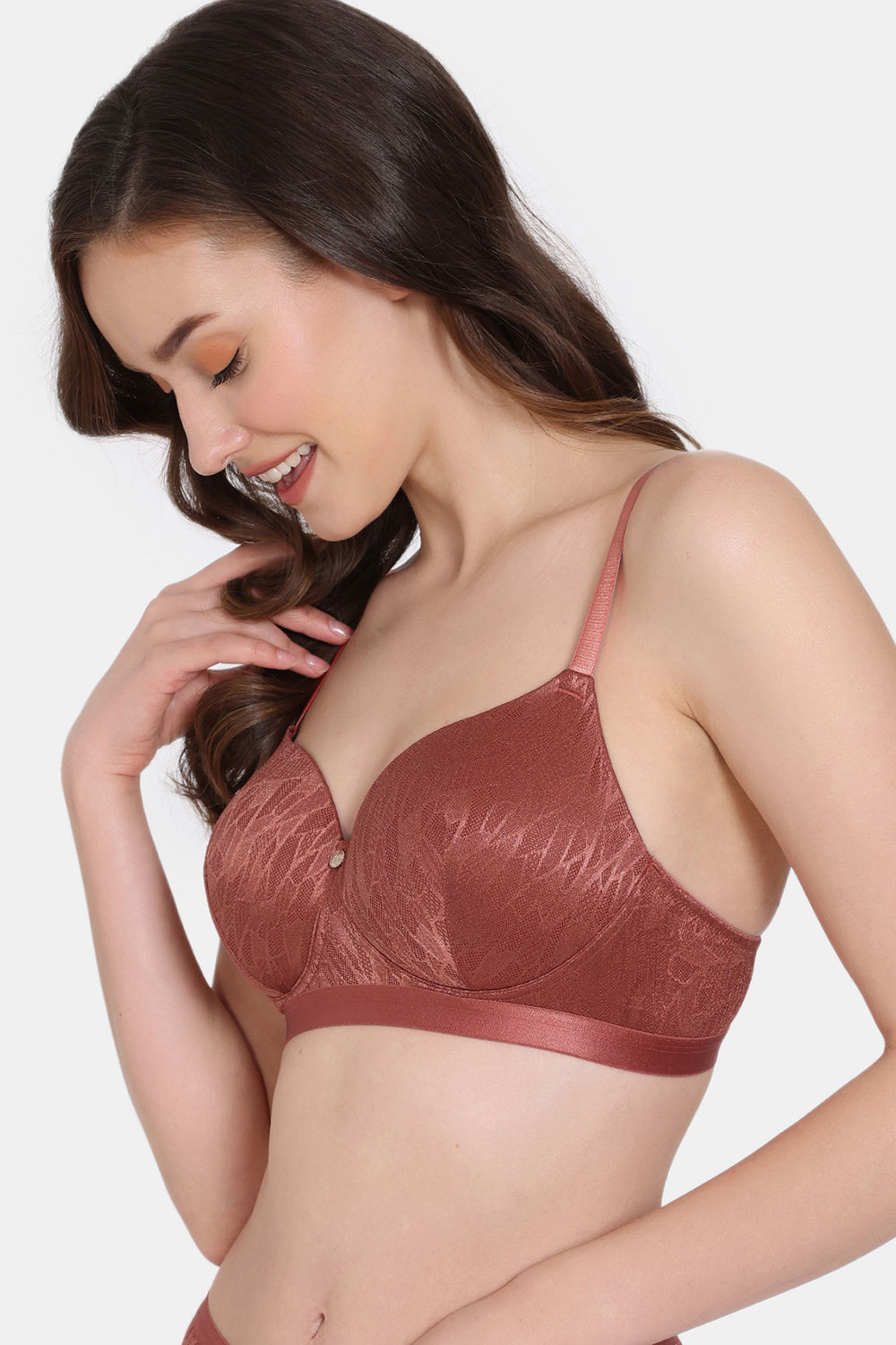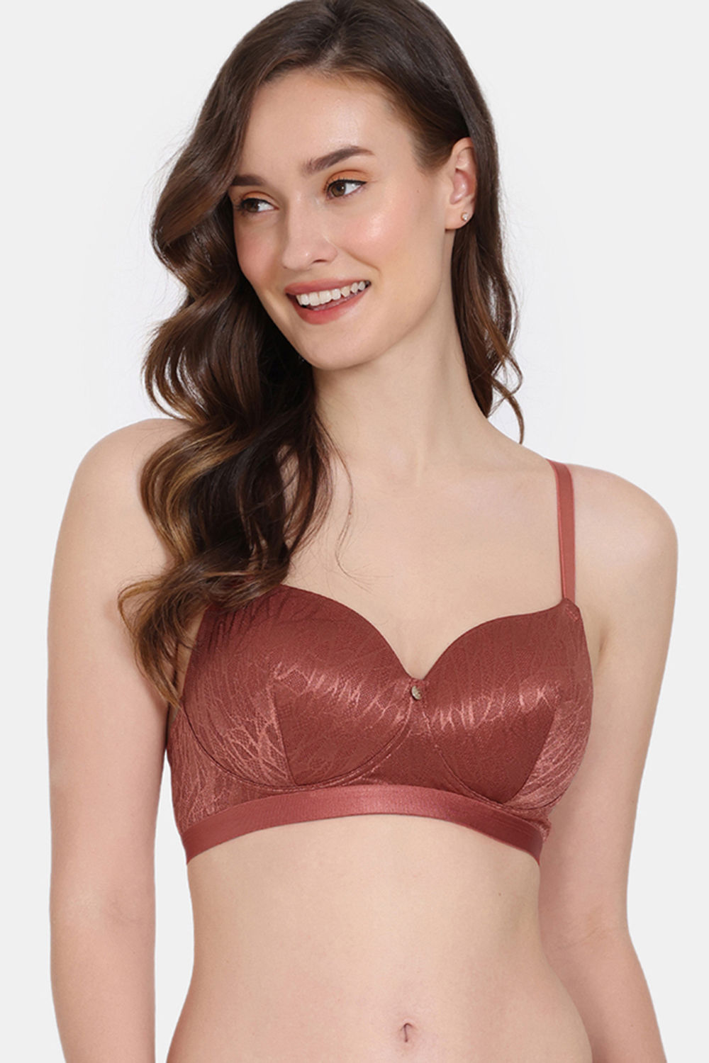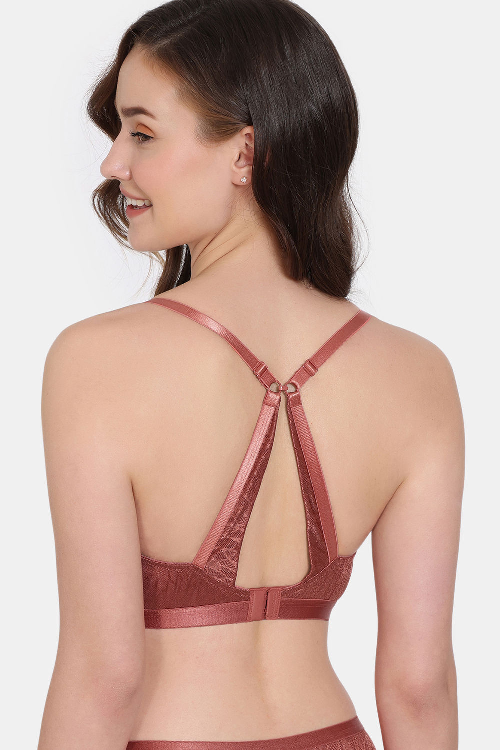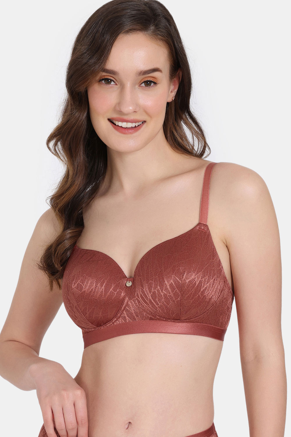 Zivame Coral Glaze Padded Non-Wired 3/4th Coverage Lace Bra With Hipster Panty and Robe - Cinnabar